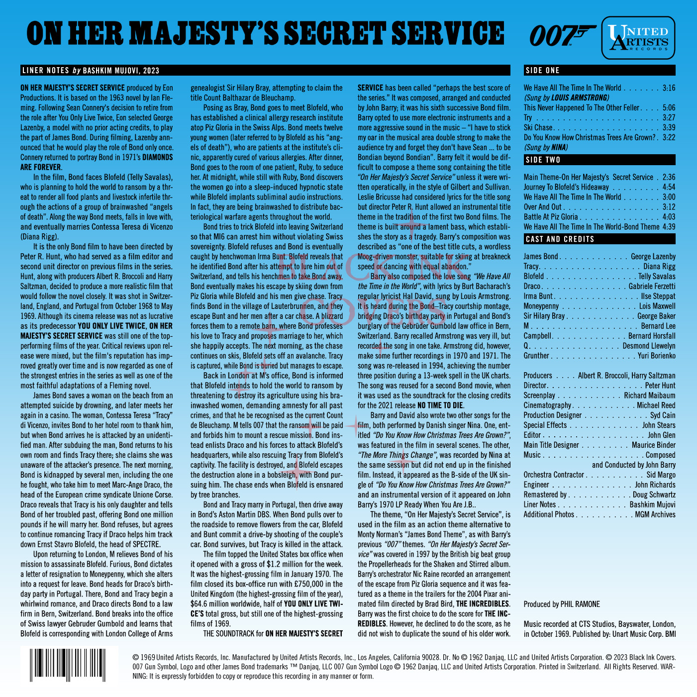 The soundtrack for On Her Majesty’s Secret Service has been called “perhaps the best score of the series.” It was composed, arranged and conducted by John Barry; it was his fifth successive Bond film. Barry opted to use more electrical instruments and a more aggressive sound in the music – “I have to stick my oar in the musical area double strong to make the audience try and forget they don’t have Sean … to be Bondian beyond Bondian.”