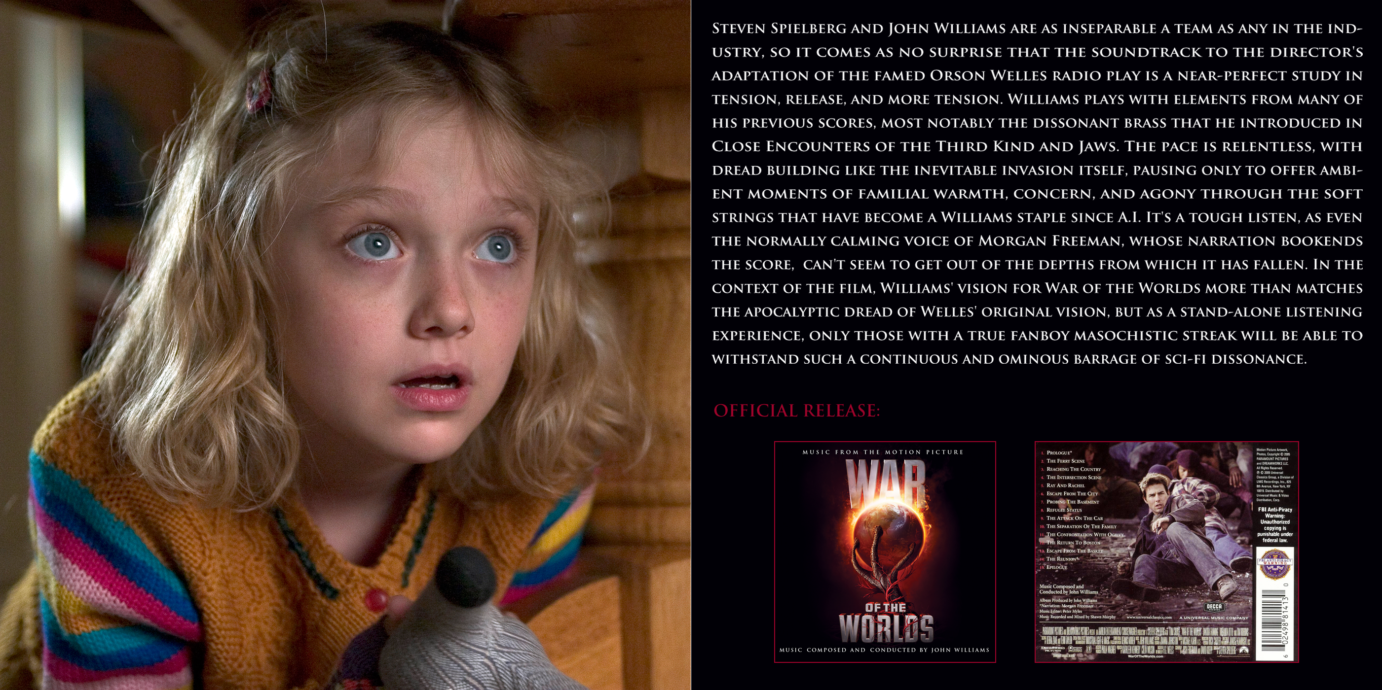 Longtime Spielberg collaborator John Williams composed the score. It was the first time he had to compose with an incomplete Spielberg film, as only the first six reels, totalling 60 minutes, were ready for him to use as reference.